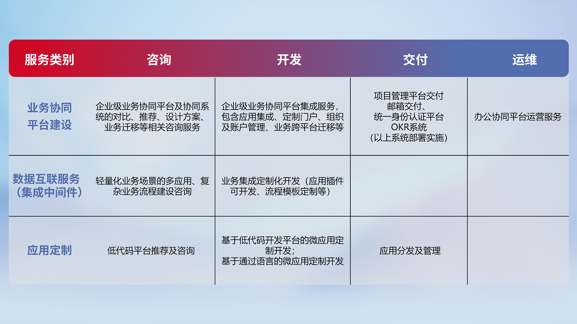 针对钉钉、、、、企微、、、IDaas等平台级产品提供产品的规划、、方案、、、交付、、定制化开发等服务,,,,实现如统一协同办公、、、智能客户服务、、、混合会议管理、、智能数据查询、、、、等业务场景,,实现数字化转型。。。。