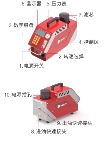 7, 定量加油功能只需将本机进油口与新油桶相连,,将出油口与减速箱注油口相连(无需安装清洗喷头)。。。